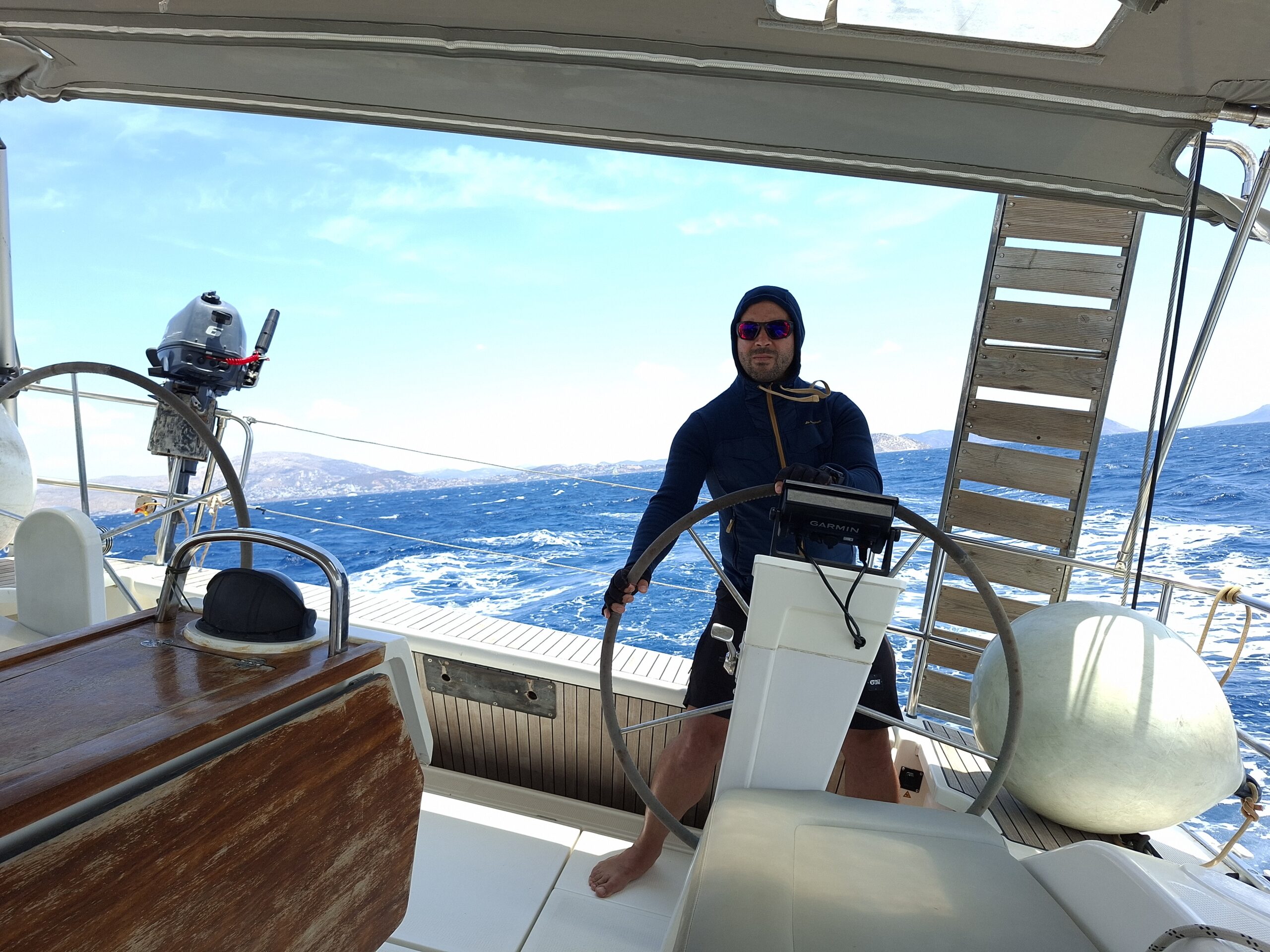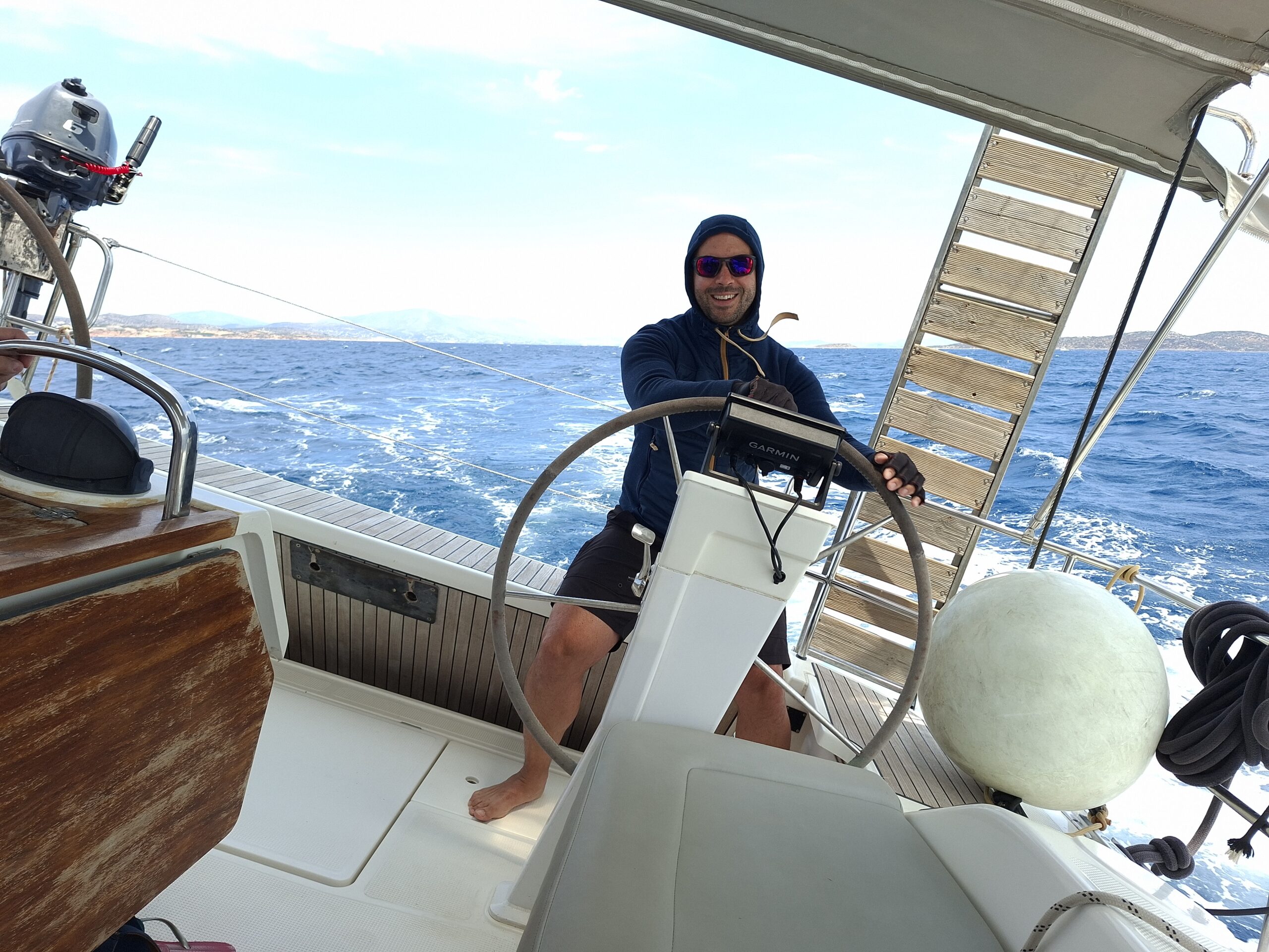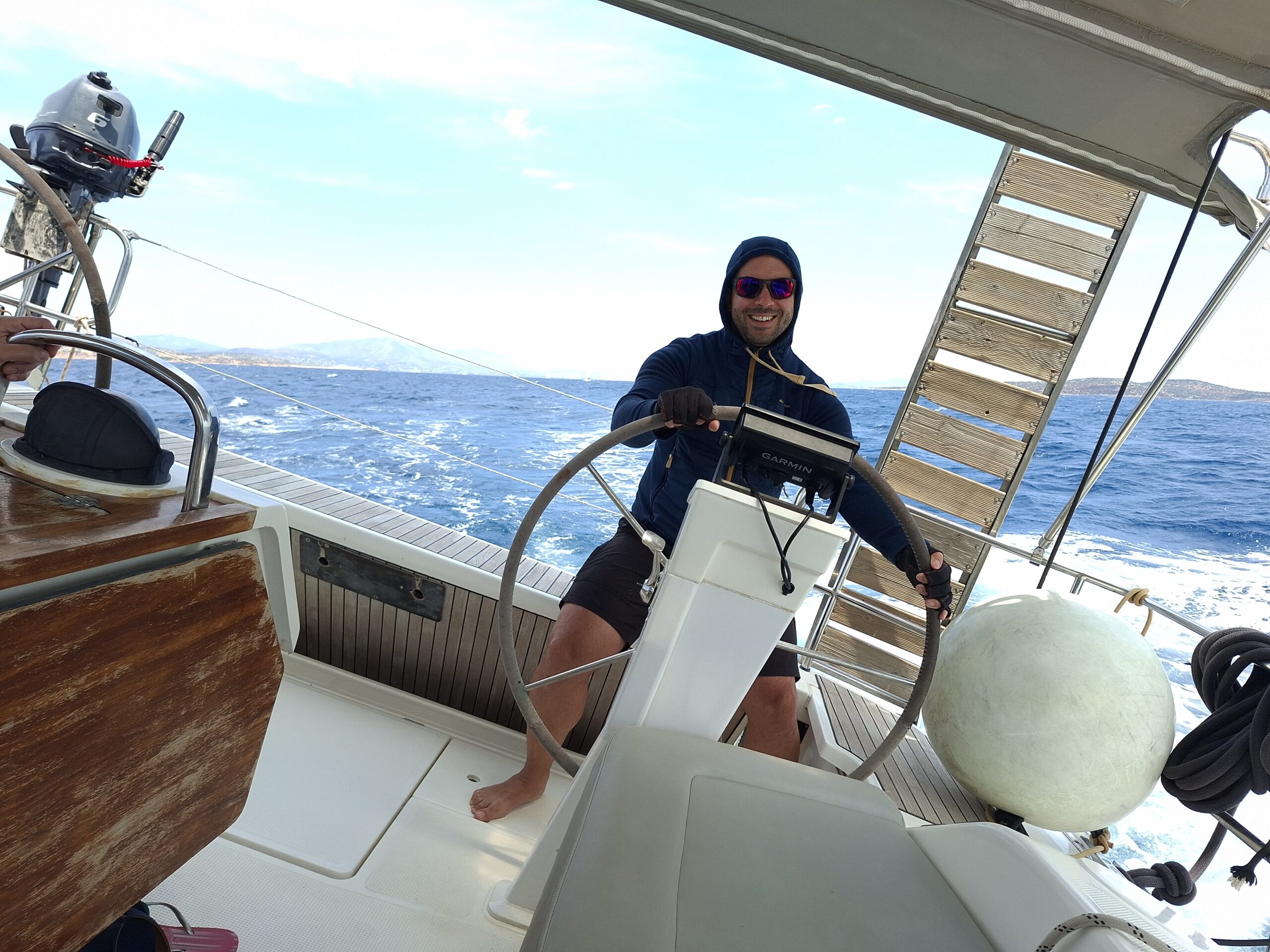 Ablegen mit der Bavaria 51 von der Alimos Marina in Athen. Unser erster Ankerstopp ist die Bucht von Anavyssos – jedoch funktioniert die Ankerwinsch nicht. Der Vermieter kommt vorbei und erklärt uns, wir müssten mit einem Hammer gegen den Ankerwindenmotor schlagen. Das Gehäuse ist bereits von zahlreichen Schlägen deformiert. Die Ankerwinsch bleibt die gesamte Woche über defekt und nur mit viel Hämmern halbwegs einsatzfähig. Von Kohlen wechseln für den Elektromotor der Winsch haben die Vermieter wohl noch nie was gehört. Es wird uns versichert, die Ankerwinsch sei „Brandneu“.