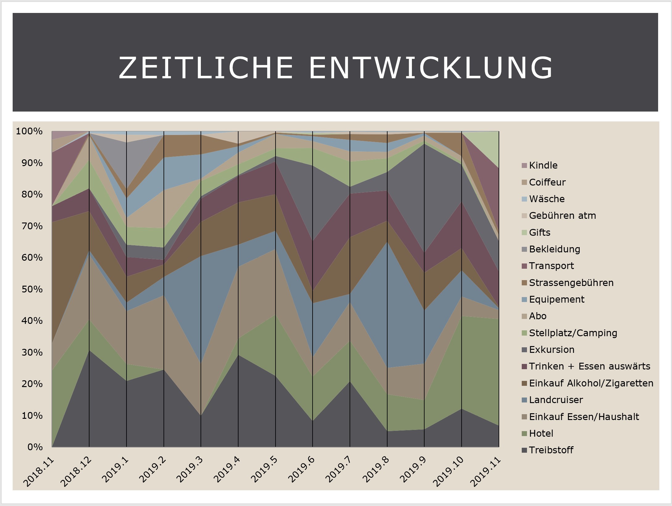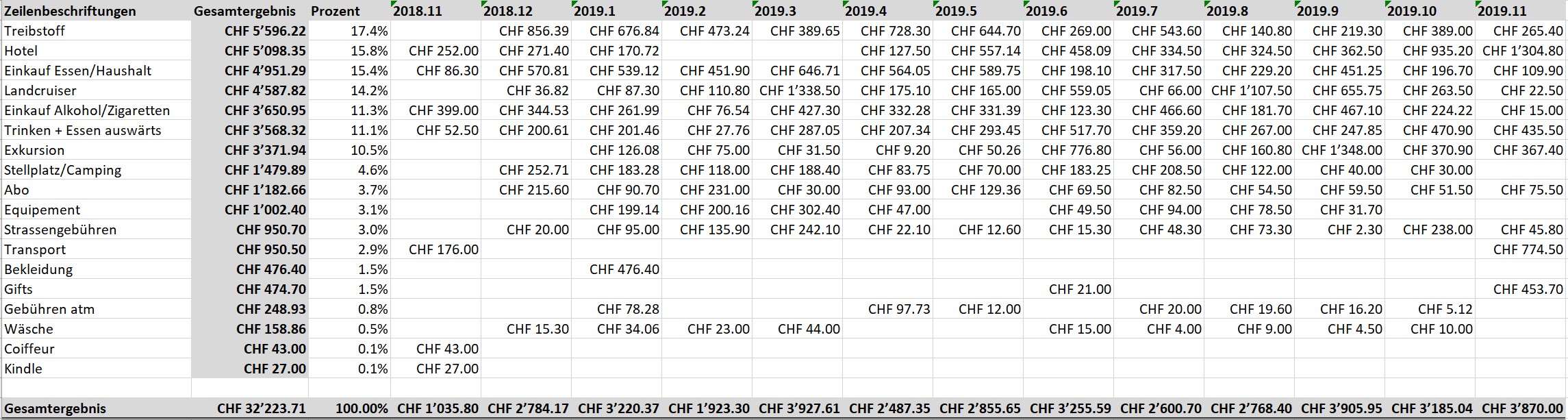 Im Verlauf der Kosten ist gut ersichtlich, dass in den ersten 6 Monaten sehr wenig Geld für Hotel oder Exkursionen ausgegeben haben. Im zweiten Teil der Reise haben wir mehr Hotel und Exkursionen gemacht.